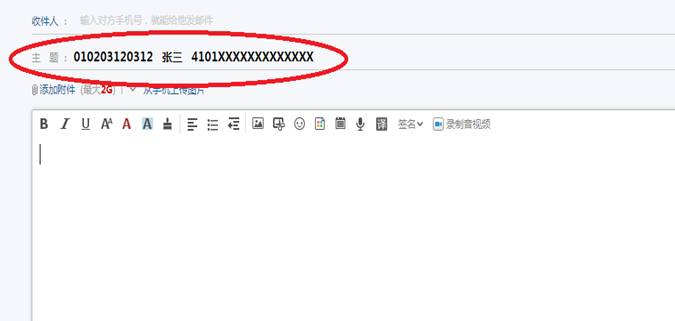 一、需要办理单科成绩证明的考生:请将本人准考证和身份证的照片或扫描的电子版发送至预约邮箱(要求能看清关键信息),邮件主题需写清:准考证号 姓名 身份证号(便于工作人员查找)(见下图1)
