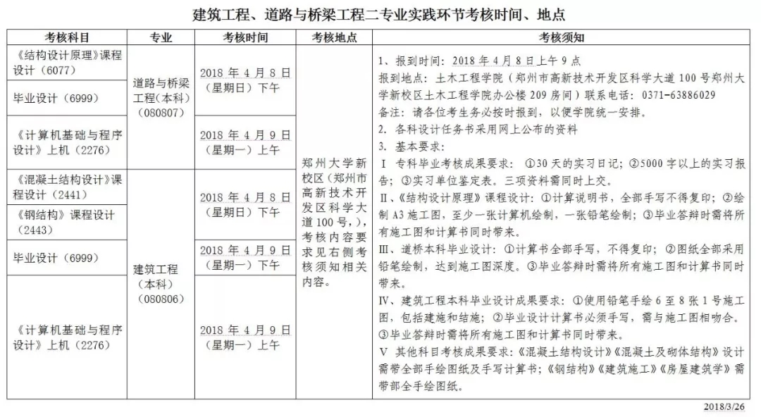 关于变更郑州大学2018年上半年建筑工程、道路与桥梁工程专业实践环节考核时间、地点的重要通知!