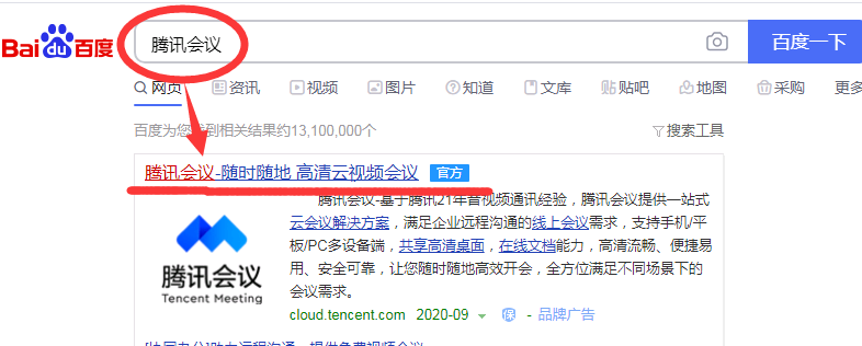 (1)打开百度,输入“腾讯会议”四个字,出现如下画面,点点画红线的链接