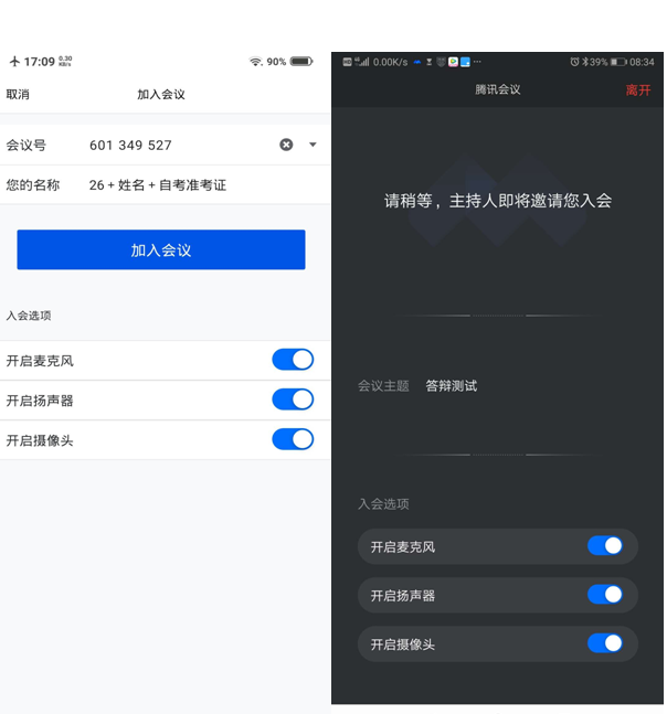 输入我们事先设定的腾讯“会议号”和会议密码(不是你手机软件的登录密码!!),“您的名称”中填入“编号”+“姓名”+“自考准考证号”(中间不要加符号!)。例如:26李庆民010101200369