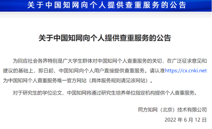 为回应社会各界特别是广大学生群体对中国知网个人查重服务的关切,在广泛征求意见和建议的基础上,即日起,中国知网向个人用户直接提供查重服务。请认准https://cx.cnki.net(编者:请点左下方“阅读原文”直达)为中国知网个人查重服务唯一官方网站(具体服务规则请见该网站)。