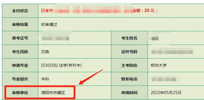 注意:其他市自考办目前没有公布时间,需要考生自己打电话咨询,可以到自己的报考平台查询自己的审核单位(如下图)(审核单位为毕业证发放单位,为需打电话咨询单位):