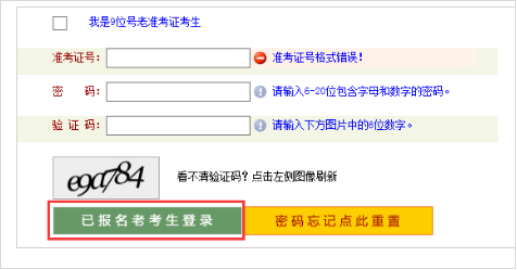 老考生无须注册,输入本人准考证号、密码、验证码,点击已报名老考生登录(图2)。