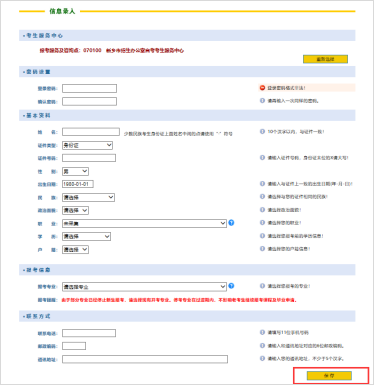 4.信息录入:设置登录密码→个人基本资料(如实填写)→报考专业信息→联系方式,填写完毕后点击保存按钮。