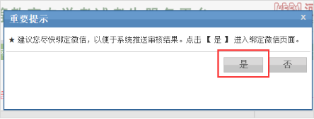 2.网页提示尽快绑定微信,以便推送审核结果,点击是按钮。