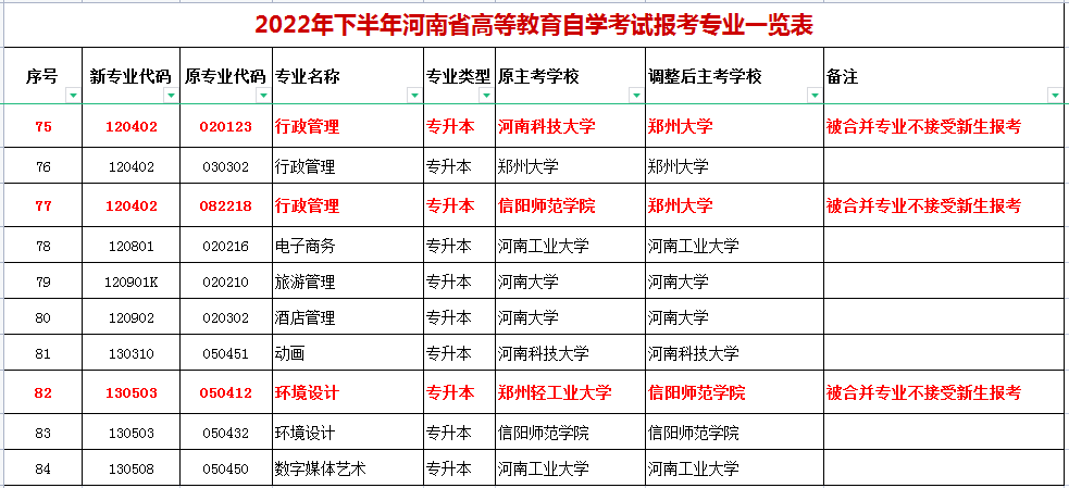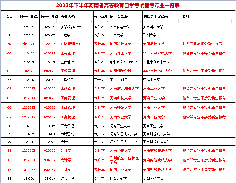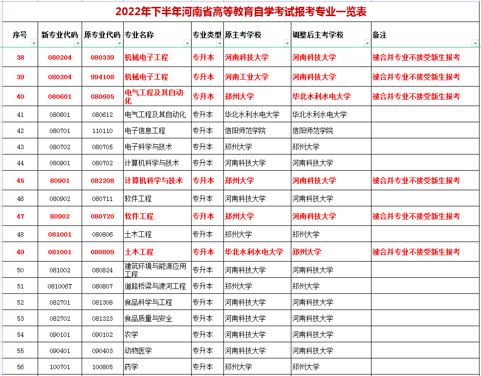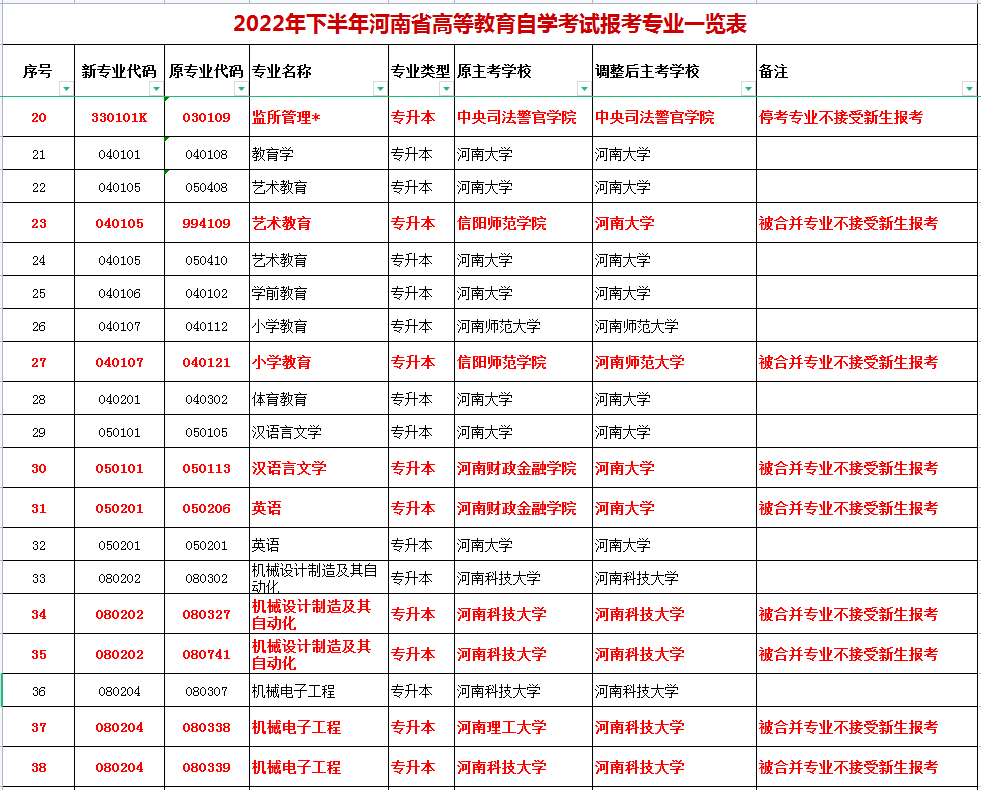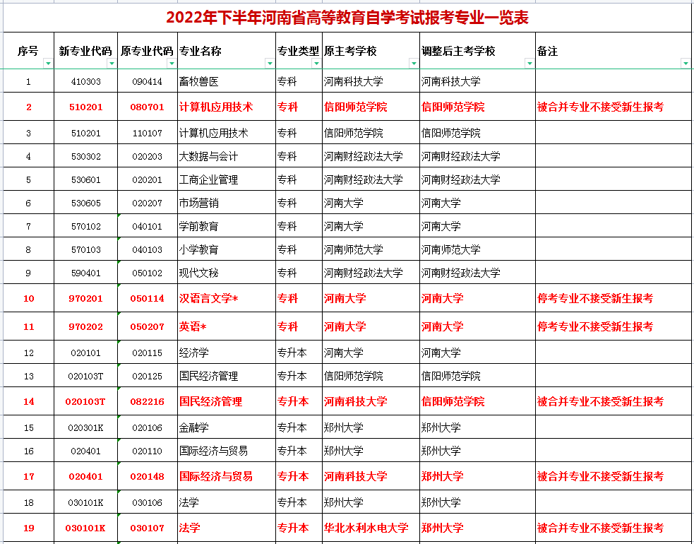 2022年下半年河南省高等教育自学考试报考专业一览表