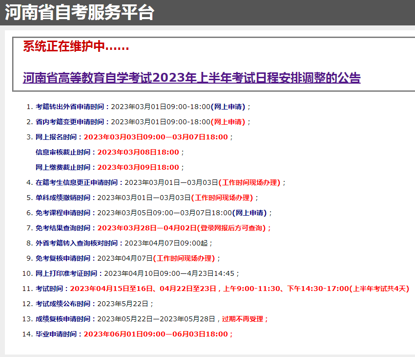 外省转入我省的考生需符合转出省转考要求,并仔细阅读“河南省高等教育自学考试考生服务平台”上的《关于自学考试外省考籍档案转入我省的有关规定》。外省考籍转入查询核对时间4月7日9:00起。