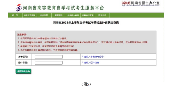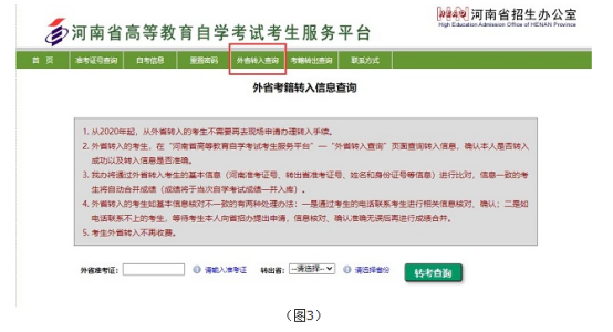②外省转入的考生,2021年10月9日起,在“河南省高等教育自学考试考生服务平台”,点击“外省转入查询”可查询转入信息,确