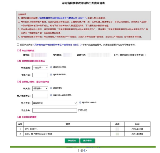 入省份,提交转出申请”→核对允许转出的课程→“申请转出”。(图4)