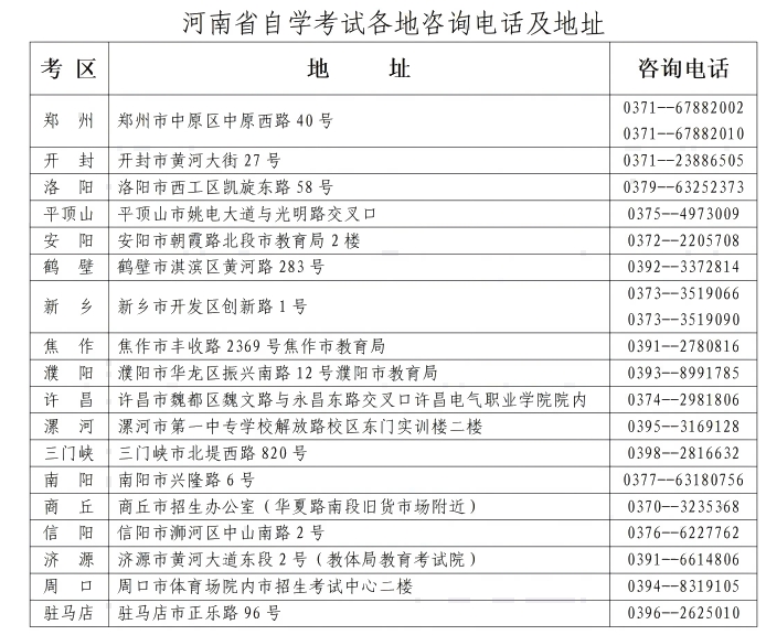 (二)考生在报名过程中遇到问题可拨打报名所属考区教育招生考试机构咨询电话(联系方式见下文)反映解决问题。同时,密切关注官方网站“河南省教育考试院”(http://www.haeea.cn)、“河南招生考试信息网”(http://www.heao.com.cn)、“河南省高等教育自学考试考生服务平台(zkwb.haeea.cn)”和官方微信公众号“河南省教育考试院”“招考豫言”及各考区教育招生考试机构发布的相关信息。