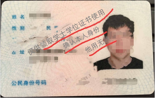 上传的身份证正反面可参考下图做简单处理(将透明胶带粘贴在需标记处并做好文字标注)