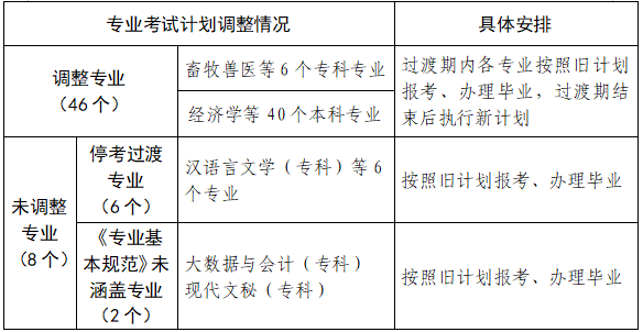 当前我省开考共54个专业,本次调整46个专业,未调整专业8个,其中停考过渡专业6个,《高等教育自学考试专业基本规范(2021年)》(以下简称《专业基本规范》)未涵盖专业2个,具体安排见下表。